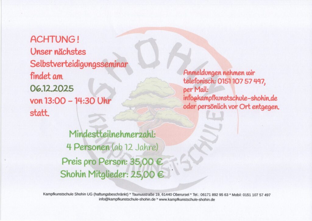 Die Angebote der Kampfkunstschule Shohin erstrecken sich auf alle Altersklassen. Habt Ihr Rückfragen oder Anregungen? Dann zögert bitte nicht uns anzurufen oder eine Nachricht über das Kontaktformular zu senden.